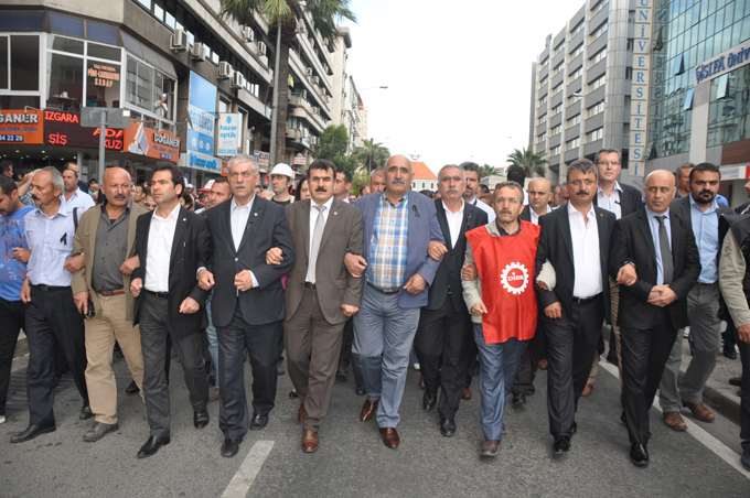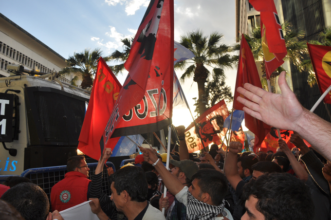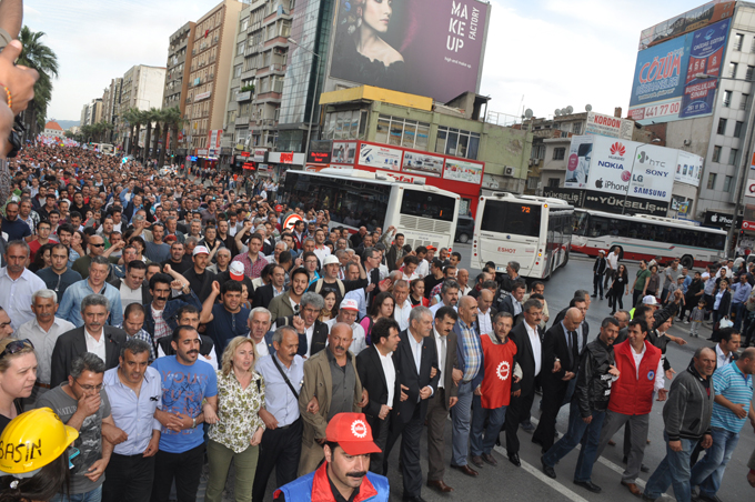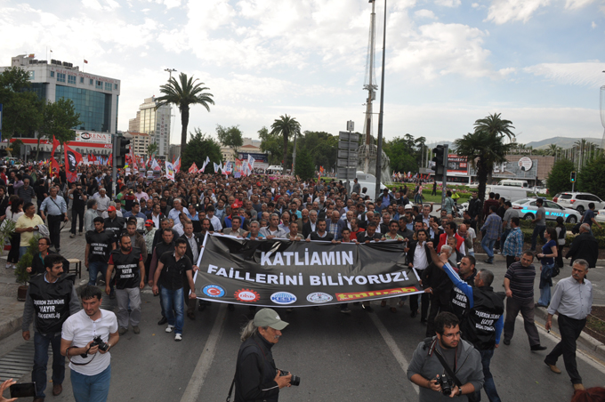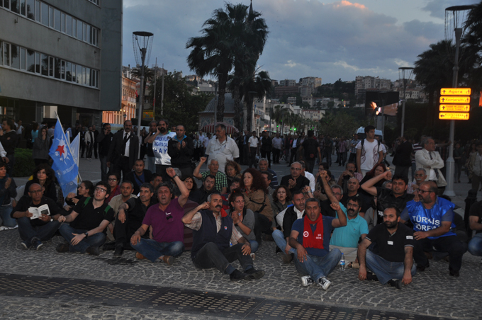 "Genel Grev, Genel Direniş", " Soma İşçisi yalnız değildir" , Soma'nın hesabı sorulacak", " Katil hükümet hesap verecek","Kaza değil bu bir cinayet" sloganlarının atıldığı eylemde İzmirliler Konak Meydanı'na akın etti. Eyleme DİSK Genel Başkanı Kani Beko, DİSK Ege Bölge Temsilcisi Memiş sarı, Kesk Dönem Sözcüsü Rukiye Çakır ve İzmir Barosu Başkanı Ercan Demir de katıldı. Islıklar ve alkışlar eşliğinde Konak Meydanı'na yürüyen kalabalık burada polis barikatı ile karşılaştı.