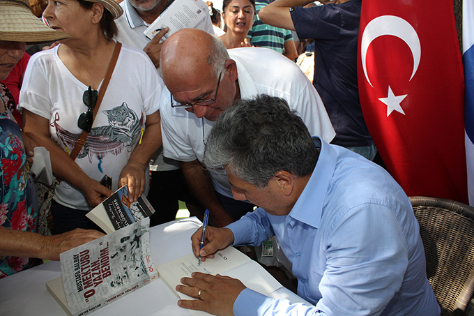 Urla Belediyesi ve CHP Urla İlçe Örgütü adına Yusuf Baratalı Mustafa Balbay’a içinde Urla’ya özgü ürünlerin bulunduğu sepet takdim etti. Söyleşi sonunda Balbay, kitaplarını okuyucuları için imzaladı.