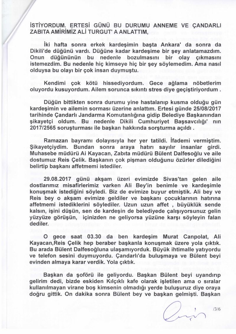 Dikili Belediye Başkanı Mustafa Tosun’un, 17 Temmuz günü akşam saatlerinde Çandarlı Ek Hizmet Binasındaki odasında kendisine sözlü ve fiziki tacizde bulunduğunu ifade eden ve olayın yaşandığı sürede belediye çalışanı olan Deniz Canpolat, önce başkandan şikayetçi olmuş, ardında bu şikayetini geri çekmişti.