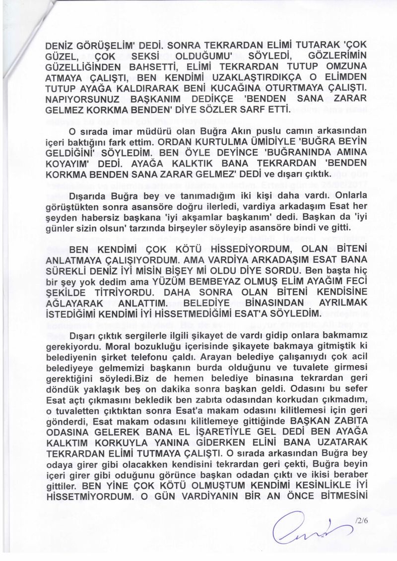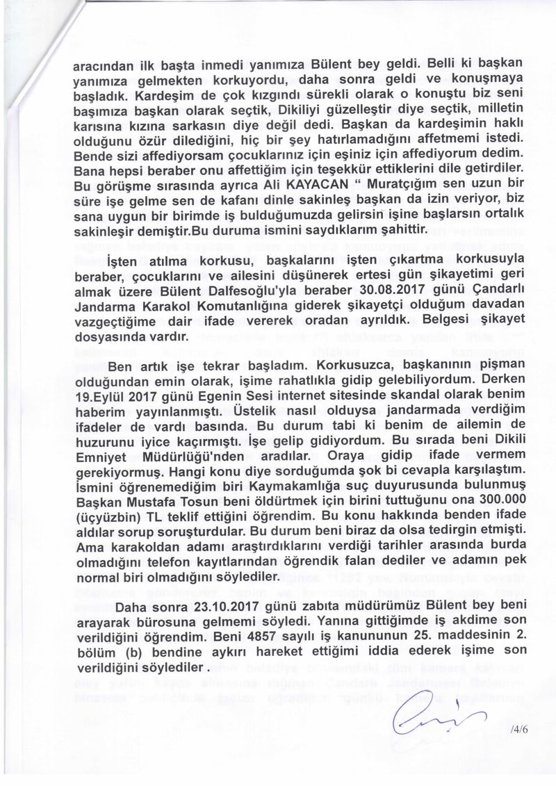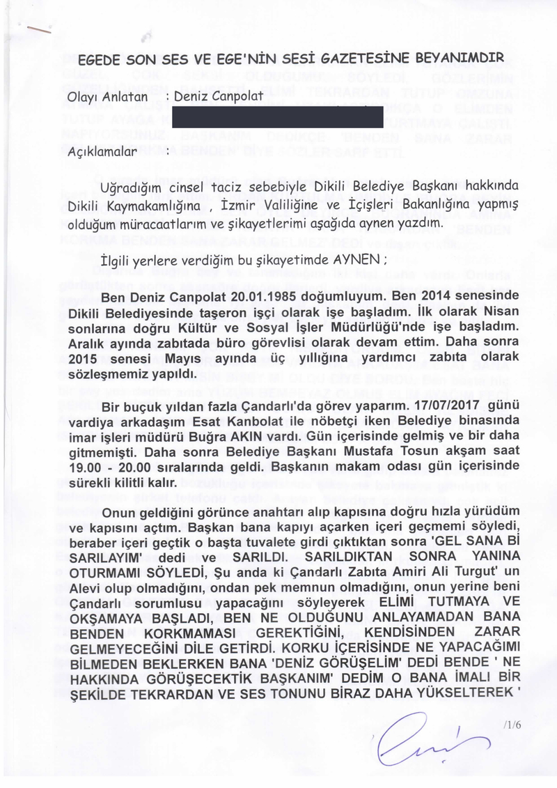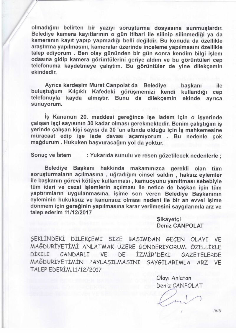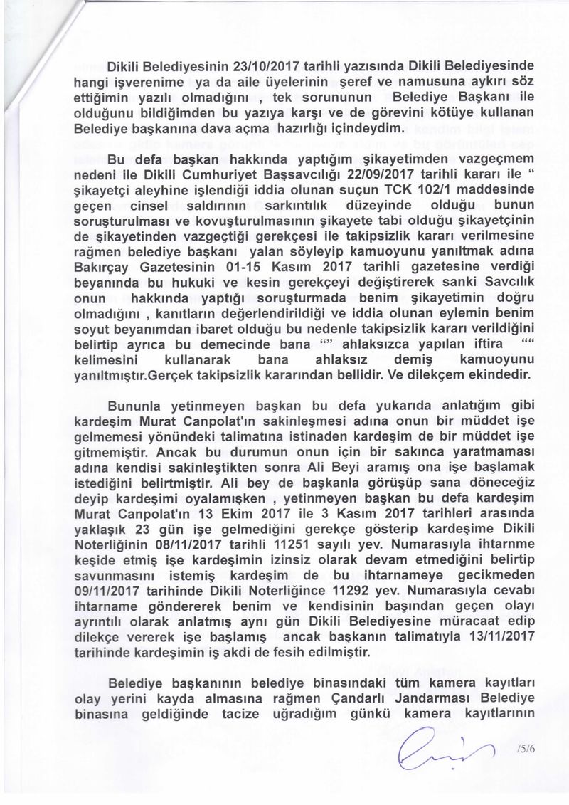 EGE’NİN SESİ- Dikili Belediye Başkanı Mustafa Tosun ile ilgili ortaya atılan taciz skandalında yeni bir gelişme yaşandı. Tosun’un kendisini taciz ettiğini iddia eden Deniz Canpolat, Dikili Kaymakamlığı'na, İzmir Valiliği'ne ve İçişleri Bakanlığı'na müracaatta ve şikayette bulundu. Canpolat, Tosun’un 17 Temmuz günü akşam saatlerinde Çandarlı Ek Hizmet Binasındaki odasında kendisine sözlü ve fiziki tacizde bulunduğunu ifade ettiği şikayetini neden geri çektiğini de “İşten atılma korkusu, başkalarını işten çıkartma korkusuyla beraber, çocuklarını ve ailesini düşünerek şikayetimi ertesi gün geri çektim” sözleriyle ifade etti.
