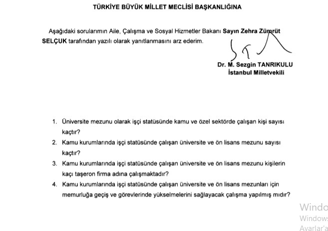 Ege'nin Sesi-CHP İstanbul Milletvekili Sezgin Tanrıkulu kamuda çalışan üniversite mezunu işçi statüsündeki çalışanların durumuyla ilgili bir soru önergesi verdi. CHP’li Sezgin Tanrıkulu Aile, Çalışma Ve Sosyal Hizmetler Bakanı Zehra Zümrüt Selçuk'un yayınlaması istemiyle verdiği soru önergesinde kamu kurumlarında işçi statüsünde çalışan üniversite ve ön lisans mezunları için memurluğa geçiş ve görevlerinde yükselme konularında çalışmalar yapılıp yapılmadığını sordu.
