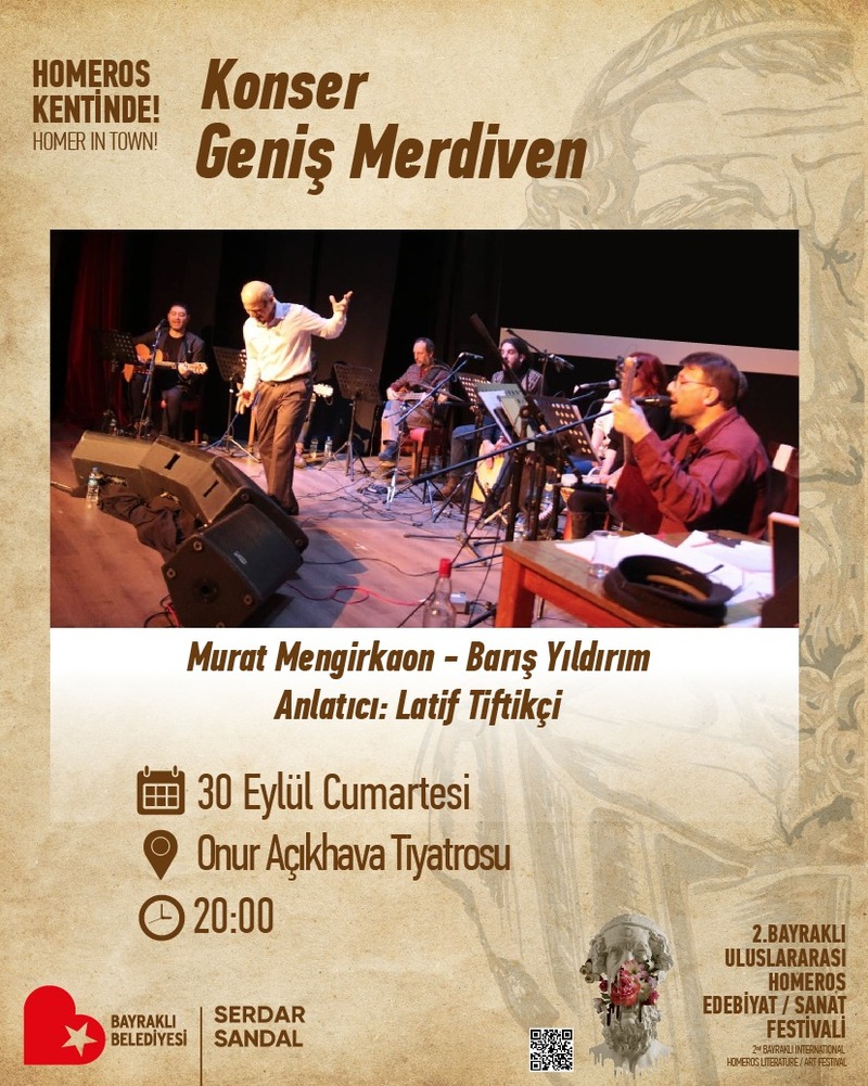 29 Eylül Cuma günü kapılarını açacak Bayraklı Homeros Festivali kapsamında konserler, tiyatro oyunları, eleştiri, yazı, tiyatro, mizah, şiir atölyeleri ve belgesel gösterimi de sanatseverlerle buluşacak. Üç günlük festivalin ilk günündeki atölye etkinlikleri 10:00-14:00 saatleri arasında kültür merkezleri ve sosyal tesislerde gerçekleşecek. 20:15’teki açılış galası konserinde Teyfik Rodos, Barış İnce, Zeynep Halvaşi ve Görkem Ezgi Yıldırım Edebi Şarkılar ile Tepekule Kongre Merkezi’nde sahne alacak.