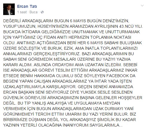 Ege'nin Sesi-Ulaş Üstündağ/Buca Belediyesi Eski Başkanı Ercan Tatı sosyal medyadan kendi döneminde yapılan Üç Fidan anıtındaki anma törenini neden uzaktan izlediğini yazdı. Tatı yazdığı mesaj da yeni seçilen Belediye Başkanı Levent Piriştina'ya göndermede bulunarak:' Bazı arkadaşlarımın ‘bu sabah seni göremedik’ mesajları üzerine bu yazıyı yazma kararı aldım. Aslında ordaydım ama uzaktan izledim. Sebebi ise arkadaşlar, görevi teslim ettiğim arkadaşlarımız inkar etse de benim hakkımda olumlu söz söyleyen facebook da beğeni yapan çalışan arkadaşlarımız ya ihtar ya da işten uzaklaştırılmayla karşılaşıyor' ifadelerini kullandı.