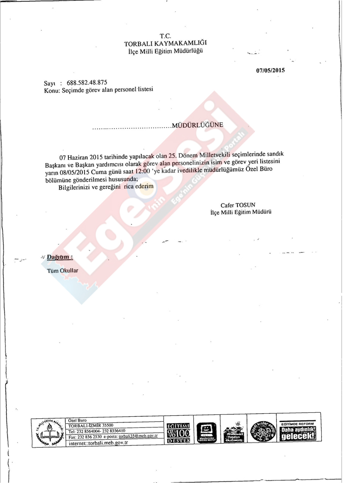 Torbalı İlçe Milli Eğitim Müdürlüğü tarafından ilçedeki okullara gönderilen belgede ise '7 Haziran 2015 tarihinde yapılacak olan 25. Dönem Milletvekili Seçimlerinde sandık başkanı ve sandık başkan yardımcısı olarak görev alacak olan personelimizin isim ve görev yeri listesini yarın 08/05/2015 Cuma günü saat 12:00'ye kadar ivedilikle müdürlüğümüz Özel Büro bölüme gönderilmesi hususunda bilgilerinizi ve gereğini rica ederim' ifadeleri yer aldı. Gönderilen belgede ise 'Özel Büro' ifadesi dikkatleri çekti.