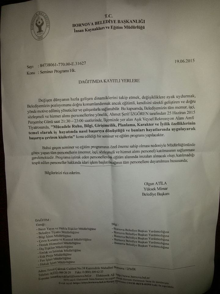 Bornova Belediyesi tarafından düzenlenecek olan seminere Belediye Başkanı Olgun Atila tarafından katılımın zorunlu olduğuna dair bir belge müdürlüklere yollandı. Olgun Atila tarafından gönderilen belgede' Programa iştirak eden personellerden eğitim alanında imzaları alınacak olup; katılmadığı tespit edilen personeller hakkında idari işlem başlatılacağının tüm personellere duyurulması hususunda bilgilerinizi arz ederim' ifadeleri yer aldı.