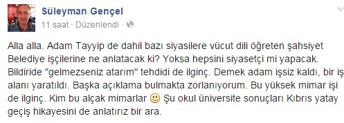 Bornova Belediye Başkanı Olgun Atilla'nın personele gönderdiği belgeyi sosyal medyadan paylaşan Gazeteci Süleyman Gencel'Alla alla. Adam Tayyip de dahil bazı siyasilere vücut dili öğreten şahsiyet Belediye işçilerine ne anlatacak ki? Yoksa hepsini siyasetçi mi yapacak. Bildiride "gelmezseniz atarım" tehdidi de ilginç. Demek adam işsiz kaldı, bir iş alanı yaratıldı. Başka açıklama bulmakta zorlanıyorum. Bu yüksek mimar işi de ilginç. Kim bu alçak mimarlar Şu okul üniversite sonuçları Kıbrıs yatay geçiş hikayesini de anlatırız bir ara' ifadelerini kullandı.