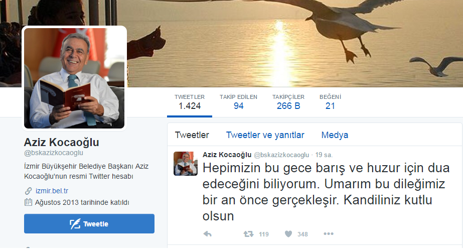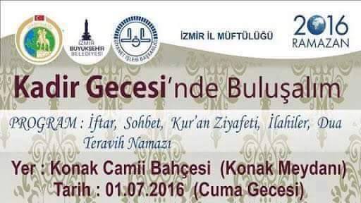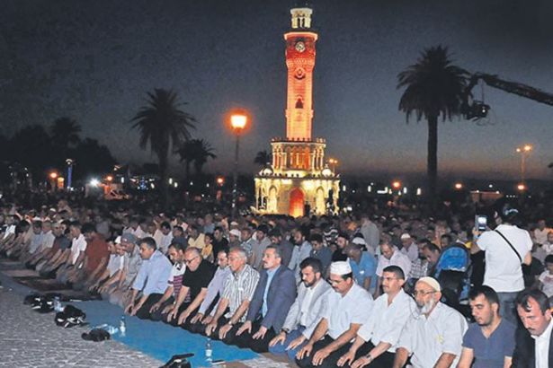 Ege'nin Sesi-İzmir Büyükşehir Belediye Başkanı Aziz Kocaoğlu gönlündeki başbakanı Binali Yıldırım olarak açıklayınca tepkileri üzerine çekmişti. Muhafazar kesime yönelik bir çok etkinliğe destek olan İzmir Büyükşehir Belediyesi Başkanı Aziz Kocaoğlu en son olarak da İzmir Valiliği ve İl Müftülüğü ile birlikte tarihi saat kulesinin olduğu Konak Meydanı’nda Kadir Gecesi etkinliğinin düzenlemesine yardımcı oldu. Meydana hasır halılar serilirken AKP İl Başkanı Bülent Delican’ın da katılımıyla onlarca insan toplu bir şekilde namaz kıldı.