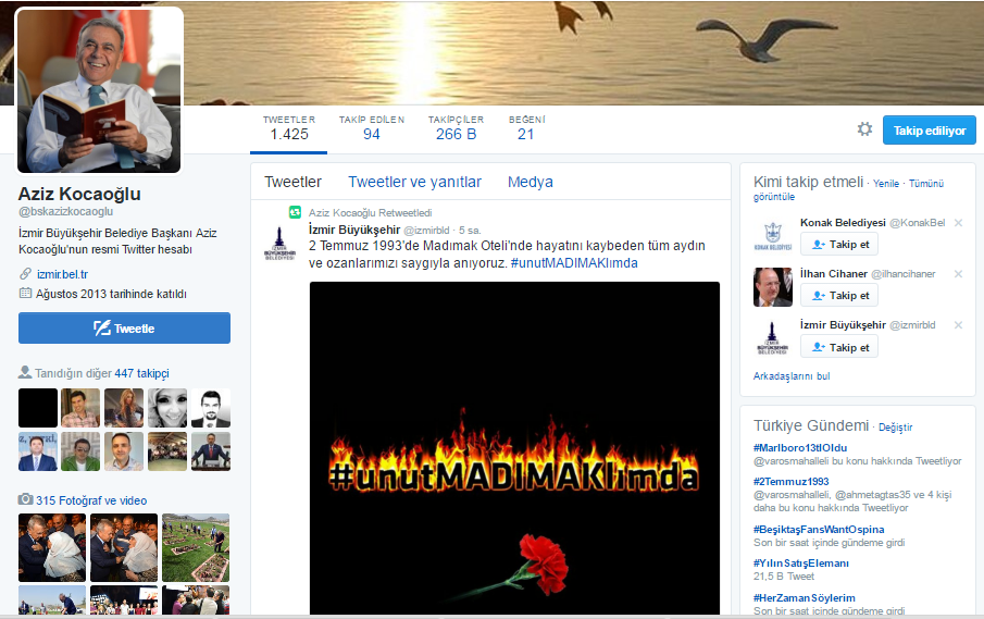 Başkan Aziz Kocaoğlu haberimizden sonra kişisel twitter adresinden İzmir Büyükşehir Belediyesi’nin Sivas Katliamı ile ilgili paylaşımını reetweetledi. Haberimiz yayına girdikten sonra paylaşımda bulunan Aziz Kocaoğlu bir hatadan dönmüş oldu.