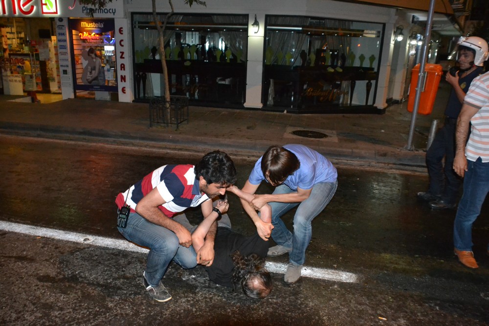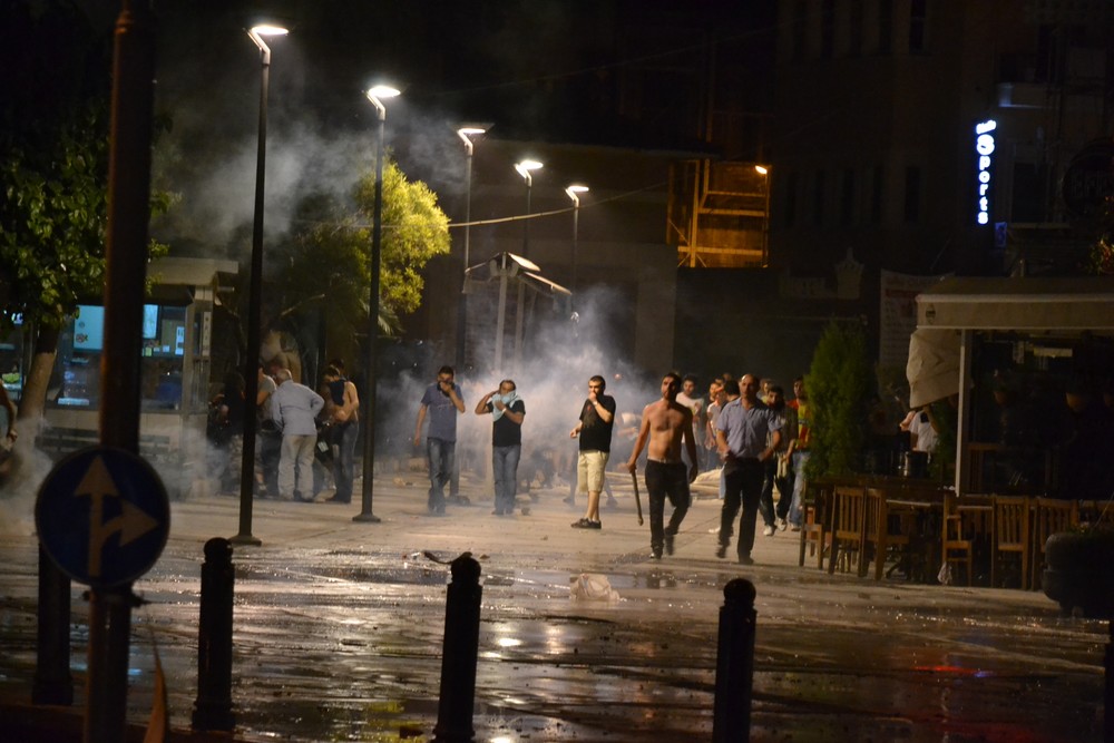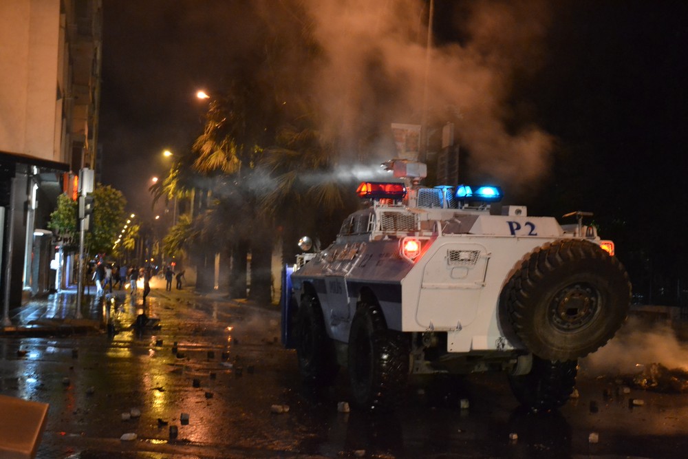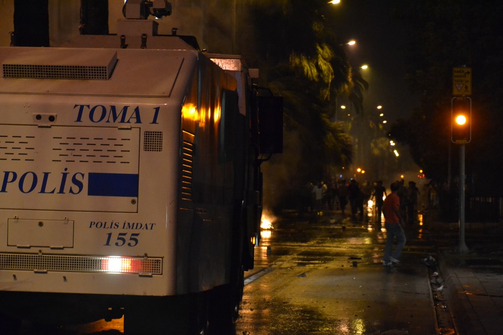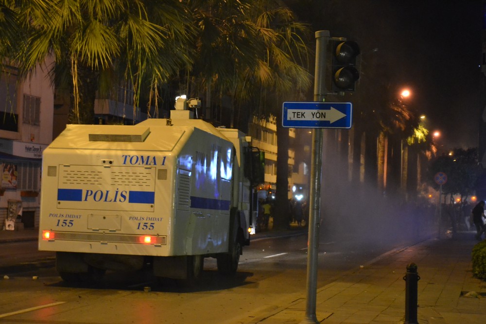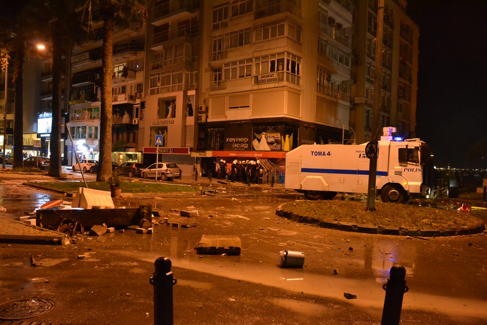 Öte yandan AK parti Konak İlçe Binası’na yürümek isteyen grup polisle karşı karşıya geldi. Basmane Çukuru’nun önünde grubun yolu kesen polis kalabalığa gaz bombaları ve tazyikli su ile müdahale etti. Kalabalık grup ile polis arasında çatışma çıkarken dakikalar süren olayda polis biber gazının ve suyun şiddetini arıttırdı. Polisin tepkisine grup da çöp kutularını atarak cevap verdi. Çok sayıda polis ekibinin hareket geçtiği iddia edilirken yaralıların olmasından korkuluyor.