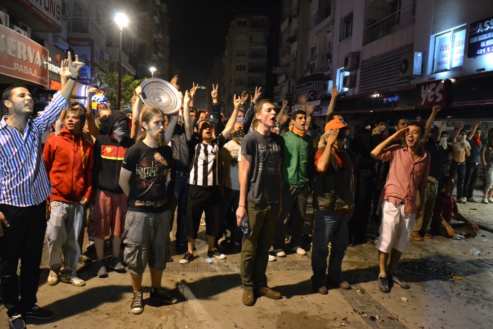 Direnişçilerin bir bölümü Kıbrıs Şehitleri Caddesi’ni kapatırken diğer bir grup ise tazyikli suyun etkisiyle Kordon’a gitmek zorunda kaldı. Direnişçiler sık sık 10. Yıl ve İstiklal Marşı’nı okurken, hükümet ve AKP’yi sloganlarla istifaya davet etti. Grup yaklaşık 2 saat polisle çatıştı. 2 saatin sonunda sonuca ulaşamayan çevik kuvvet ekipleri ile TOMA ve panzerler geri çekildi. Kalabalık grup buradan Gündoğdu Meydanı’na geçti ve T.C. kısaltması bulunmayan bir Ziraat Bankası’na sprey boya ile T.C. yazdı. Gündoğdu Meydanı’nda buluşan grup dağılmayarak desteğe devam edeceğinin sinyalini verdi.