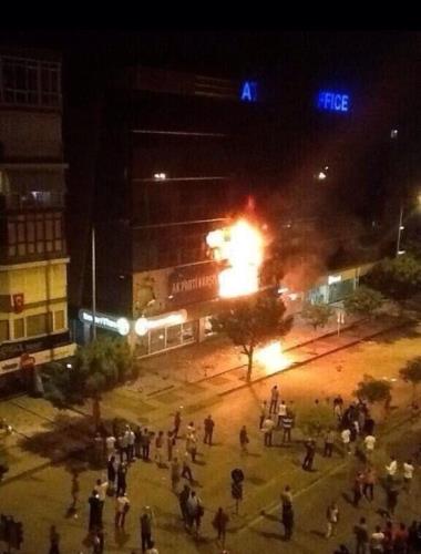 Karşıyaka Girne Bulvarı'nda toplanan bir grup, buradan hükümet ve Başbakan Recep Tayyip Erdoğan aleyhinde slogan atarak yürüyüşe geçti. AK Parti Karşıyaka İlçe Başkanlığı binası önüne gelen gruptakilerden bazıları binaya molotofkokteyli ve taş fırlattı. Atılan molotofkokteyllerinden birisinin isabet etmesi sonucu parti binasında yangın çıktı. Bina alev alev yanarken, olay yerine gelen itfaiye ekipleri yangına müdahale etti. Yangında ölen yada yaralanan olmadı. Polis, olayla ilgili olarak soruşturma başlattı.