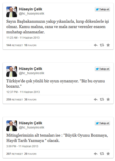 Önce “Türkiye’de çok yönlü bir oyun oynanıyor. Biz bu oyunu bozarız” twittini atan Çelik, daha sonra attığı twittlerde ise “Mitinglerimizin alt temaları ise: ‘Büyük Oyunu Bozmaya, Haydi Tarih Yazmaya’ olacak.