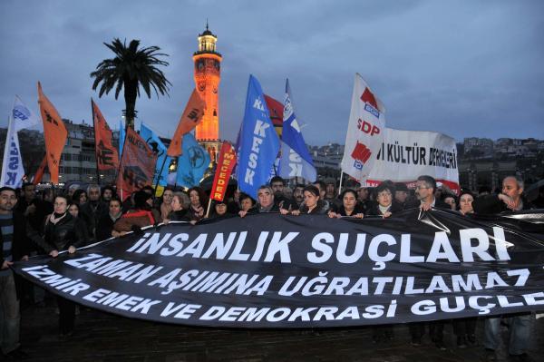 Saat 18.00 sularında Konak’taki alışveriş merkezi önünde toplanan aralarında KESK İzmir Şubeler Platformu, DİSK Ege Bölge Temsilciliğil, TMMOB ve çeşitli sivil toplum örgütlerinin üyelerinin bulunduğu yaklaşık 300 kişi Konak Meydanı’na kadar yürüyüş yaptı. 'Sivas ışığı sönmeyecek', 'Faşizme karşı omuz omuza' sloganları atan grup daha önce hiçbir gruba eylem için izin verilmeyen tarihi saat kulesi önünde açıklama yaptı. Grup adına konuşan KESK İzmir Şubeler Platformu Sözcüsü Ramis Sağlam, “Bu kararla içimiz tekrar kan ağladı. AKP iktidarı tarafından ölenler tekrar ateşin içine atıldı. İnsanlık suçu zaman aşımına uğratılamaz, Sivas’ın arkasındaki güçler bir an önce açığa çıkartılmalı. Gerçek katiller adalet önünde yargılanmalıdır” dedi.