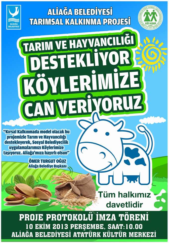 Belediye’nin “Tarım ve Hayvancılığı destekliyor, Köylerimize can veriyoruz” sloganı ile adını duyurduğu proje, Aliağa Belediyesi ile İzmir Köy Kalkınma ve Diğer Tarımsal Amaçlı Kooperatifler Birliği (KÖY-KOOP İzmir) arasında gerçekleştirilen protokol ile start aldı.
