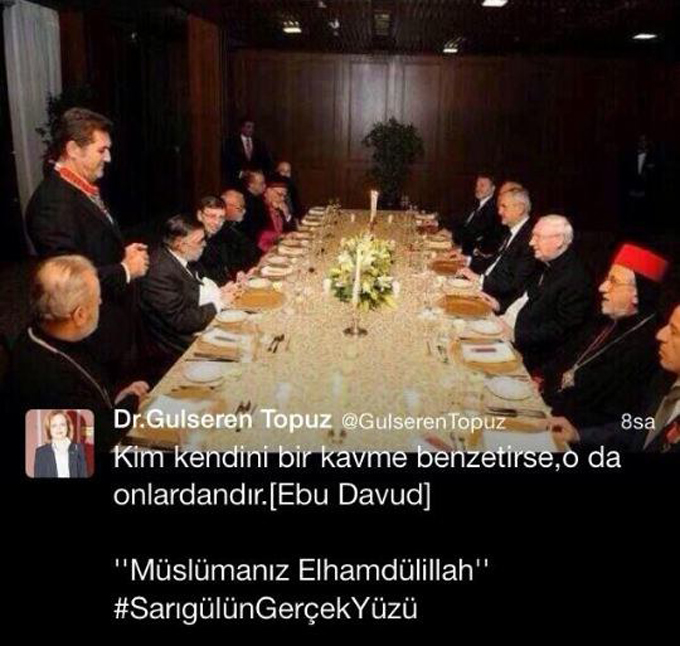 Hürriyet'ten Zeynep Gürcanlı'nın haberine göre, TBMM'de 22. dönem (iki dönem önce) AKP'den İstanbul Milletvekili olarak görev yapan Topuz, twitter hesabında Mustafa Sarıgül'ün gayrimüslimlerle yaptığı bir toplantı fotoğrafını paylaşıp, altına da "Kim kendini bir kavme benzetirse o da onlardandır. (Ebu Davud)" yazdı. Altına da "Müslümanız Elhamdülillah" ibaresini "#SarigülünGerçekYüzü" hashtagini ekledi.