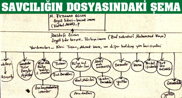 16 yıldır Cemaat'in içinde olduğunu belirten işadamı Ahmet Sarıtaş, el yazısıyla gönderdiği ikinci ifadesinde bir de şema çizdi. Şemada bir numara “Kâinat İmamı” Fethullah Gülen. Örgüt şemasında başyardımcı ve “Türkiye imamı” olarak Mustafa Özcan gösterildi. Özcan’ın yardımcıları da cemaate yakın olan Kaynak Holding’in Yönetim Kurulu Başkanı Naci Tosun, holding yöneticileri ve Ahmet Kara olarak belirtildi. Örgüt içindeki hiyerarşide “Türkiye İmamı” ve yardımcılarına bağlı olan kuruluşlar, gazete, dergi ve TV’ler, kamu çalışanları, şirketler, dershaneler, yurtlar, işadamları, üst düzey bürokratlar ve ışık evlerinde yaşayan öğrenciler gösterildi.