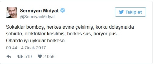 15 Temmuz darbe girişiminin ardından, 20 Temmuz’da ilan edilen OHAL, üçüncü kez uzatıldı. Milli Güvenlik Kurulu toplantısı yapılmadan gerçekleştirilmesi TBMM’de tartışmaya neden olurken, Sermiyan Midyat’ta toplumun içinde olduğu duruma ve OHAL’e kendi üslubuyla bir şey yazdı.
