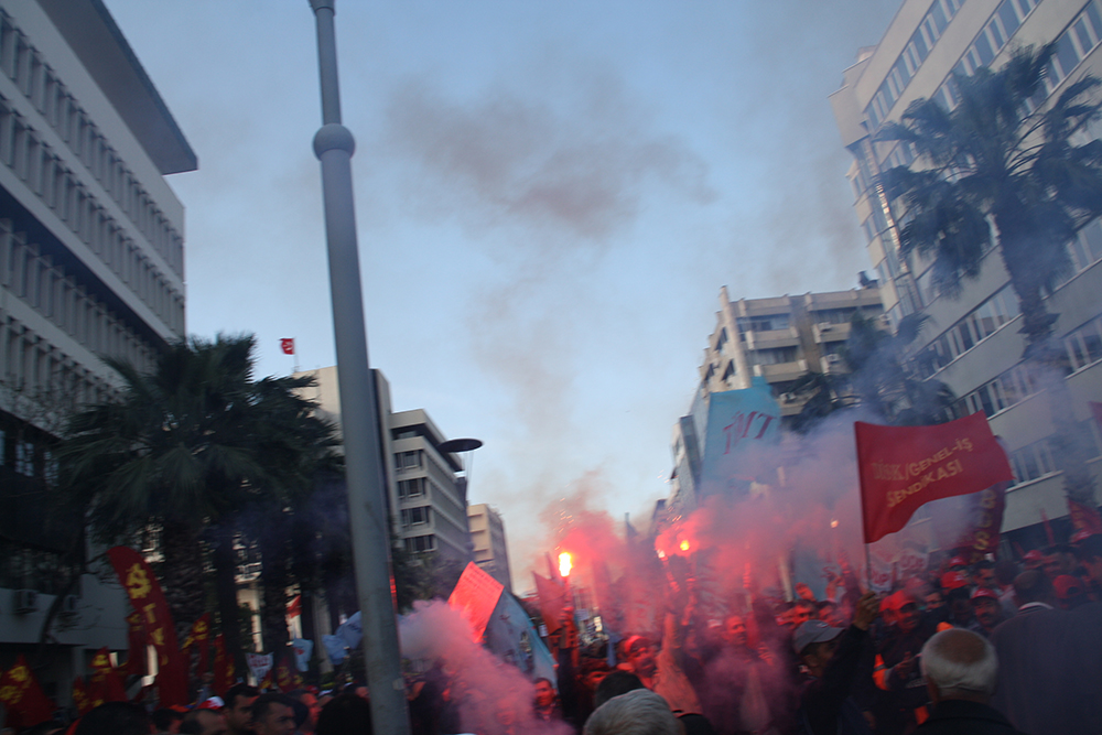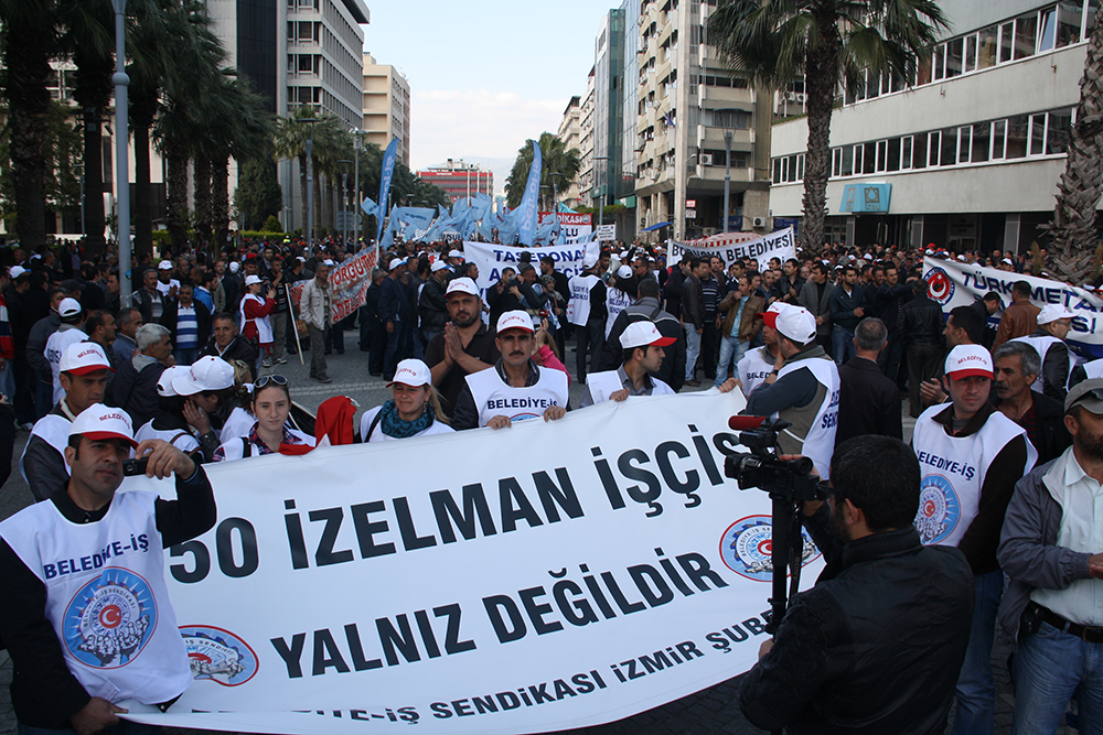 ‘Taşeronlaşmaya hayır!’, Kölelik Düzenine Hayır!’, Güvencesizliğe hayır!’, ‘Yaşasın emeğin yenilmez gücü!’, ‘Yaşasın emekçinin birlik ve beraberliği!’ sloganları eşliğinde binlerce işçi Basmane Fuar Kapısı önünden İzmir Büyükşehir Belediyesi önüne kadar yürüdü. Omuz omuz omuza dayanışmalarını sürdüreceklerini belirten kalabalık pes etmeyeceklerini dile getirdi.
