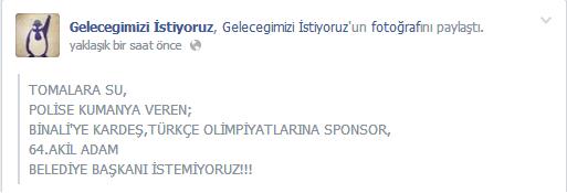 ‘Geleceğimizi İstiyoruz’ adıyla bir sayfa açan grup, Başkan Kocaoğlu’nu bir dönem daha İzmir Büyükşehir Belediye Başkanlığı koltuğunda görmek istemediklerini belirterek, “TOMAlara su, polise kumanya veren; Binali'ye kardeş, Türkçe Olimpiyatları’na sponsor, 64.akil adam belediye başkanı istemiyoruz!!!” diyerek kamuoyuna seslendi.