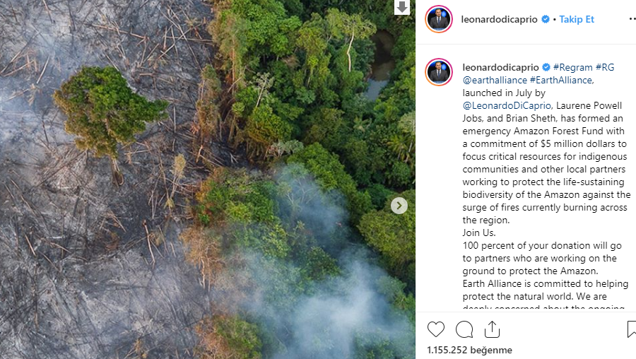 DiCaprio, “Dünyanın ciğerleri” olarak bilinen Amazonları restore etmek ve korumak için başlattığı kampanyada sosyal ağlar aracılığıyla, hayranlarını da bu önemli göreve katkıda bulunmaya davet etti. Ayrıca “Bağışlarınızın yüzde 100'ü Amazon'u korumak için çalışan insanlara gidecek” diye söz verdi.
