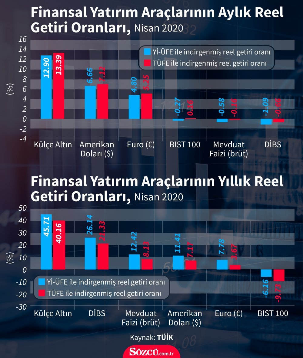 Türkiye İstatistik Kurumu (TÜİK), 2020 nisan dönemi finansal yatırım araçlarının reel getiri oranlarını açıkladı. Buna göre; en yüksek aylık reel getiri, yurt içi üretici fiyat endeksi (Yİ-ÜFE) ile indirgendiğinde yüzde 12,90, tüketici fiyat endeksi (TÜFE) ile indirgendiğinde ise yüzde 13,39 oranlarıyla külçe altında gerçekleşti.