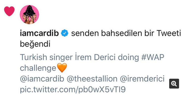 Gerçek adı Belcalis Almanzar olan Grammy ödüllü Cardi B.’nin Billboard Listesi dahil her yerde bir numara olan Wap şarkısını söyleyen İrem Derici’nin videosuna twitter ’da beğendi.