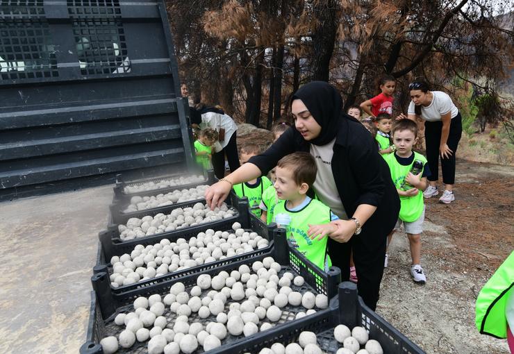 Bornova Belediyesi, yanan ormanların yeniden yeşermesi için hazırlanan tohum toplarını anaokulu öğrencileri aracılığıyla doğayla buluşturdu.