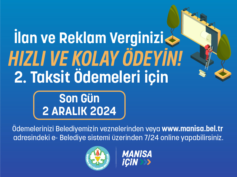Manisa Büyükşehir Belediyesi, İlan ve Reklam Vergisi 2. taksit ödemeleriyle ilgili açıklama yaptı. Büyükşehir Belediyesi Mali Hizmetler Dairesi Başkanlığı'nca yapılan açıklamada İlan ve Reklam Vergisi 2. taksit ödemeleri için son günün 2 Aralık 2024 tarihi olduğu belirtildi.