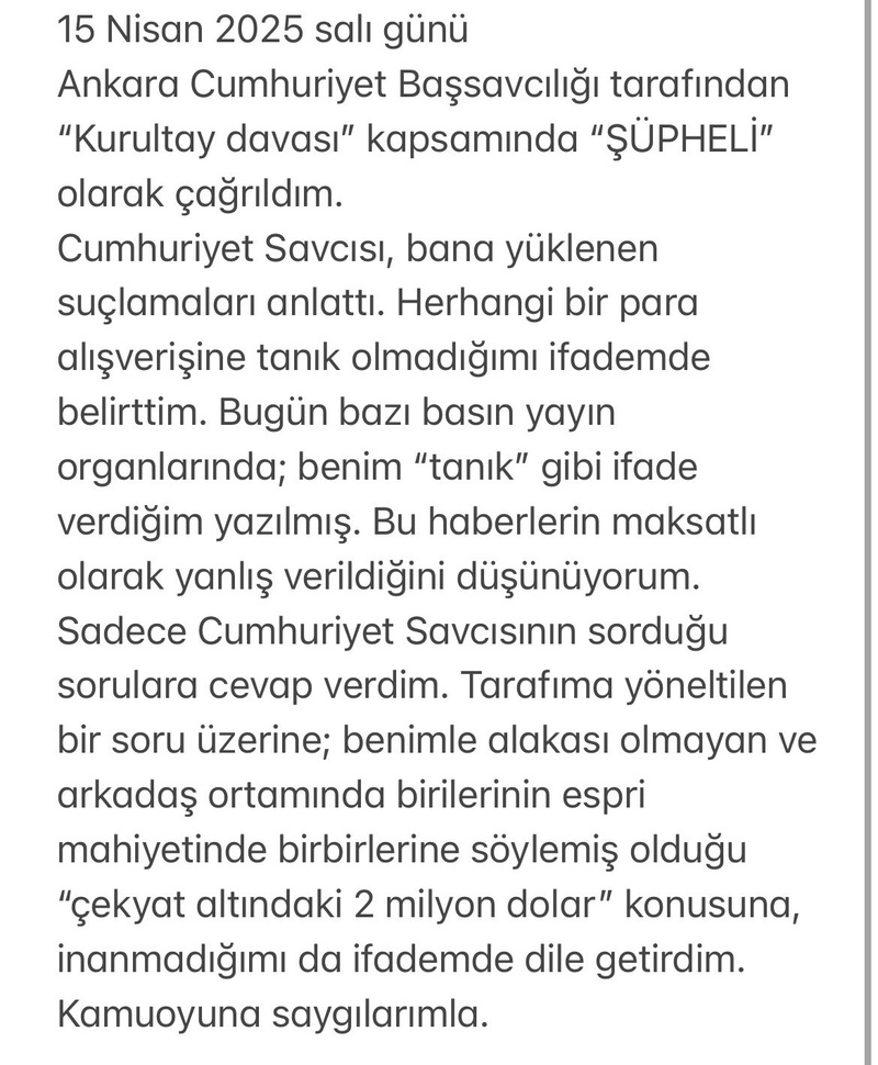 "Bulunduğu yere gittiğimde elinde takım elbise ile bir adet ayakkabı poşeti vardı. Kendisine 'Bunlar nedir?' diye sorduğumda bana 'İl Başkanı Serhat Can Eş'in hediyesi' dedi. Otele döndüğümde Erzurum kurultay delegelerinden isimlerini hatırlamadığım 3-4 kişinin daha aynı takım elbise ve ayakkabı poşetlerinin ellerinde olduğunu gördüm. Onlara da Erzurum il başkanı bu hediyeleri vermiş. Kurultaydan bir gün önce Yusuf Gögerkaya'ya 'Erzurum il başkanı gerçekten para almış mı' diye sorduğumda, bana hitaben 'Evet almış ama duyumumuz çok yüksek miktar, bize verdiği ise 1000-1500 dolar. Ben de bu parayı harcamam, saklarım, başıma bela olmasın' dedi. Bu sırada yanımda arkadaşım Mustafa Erdoğdu vardı. Mustafa Erdoğdu benim 20 yıllık tanıdığım, kendisine ağabey dediğim kişidir. Kendisi eski Sosyal Demokrat Halk Partisi (SHP) Gençlik Kolları Genel Başkanı idi. Daha sonra CHP'ye katıldı. Kendisi Özgür Özel'in seçim ofisinin yöneticisi idi. Özel'in seçim ofisinin giderlerini ve harcamalarını o yapıyordu. Seçim ofisi için yapılan masrafların da milletvekillerinden toplanarak Ankara Milletvekili Umut Akdoğan tarafından Mustafa Erdoğdu'ya verildiğini biliyorum. Ben Ankara'da bulunduğum zaman Mustafa Erdoğdu'nun evinde kalırdım. Mustafa Erdoğdu'nun kendisine gelen paraları delegeleri ikna etmek için harcayıp harcamadığını bilmiyorum. Ancak kendisine ofis giderleri için para verildiğini biliyorum. Mustafa Erdoğdu benim de içerisinde bulunduğum kalabalık bir sohbet ortamında 'Yanımda kalan Emir'in haberi yok. Benim evimde Emir'in yattığı çekyatın altında İstanbul'dan kurultay delegelerine dağıtılmak için gönderilen 2 milyon dolar para vardı. Emir'in haberi yok' diye konuştu. Ancak ben bu konuyu öylesine söylenmiş bir söz olarak değerlendirdim. Ben böyle bir konuya inanmadım."
