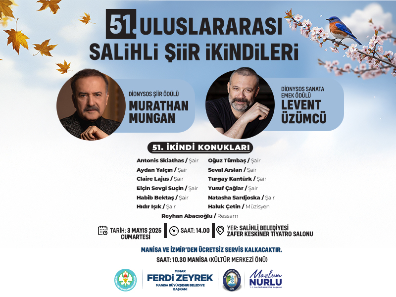 Türkiye’nin en uzun soluklu şiir etkinliklerinden Salihli Şiir İkindileri, uzun bir aradan sonra Manisa Büyükşehir Belediyesi ve Salihli Belediyesi iş birliğiyle yeniden hayat buluyor. İlk kez 1985 yılında düzenlenen ve 2013 yılına kadar kesintisiz devam eden etkinlik, 3 Mayıs 2025 Cumartesi günü 51. kez edebiyat ve sanat dünyasının önemli isimlerini bir araya getirecek.