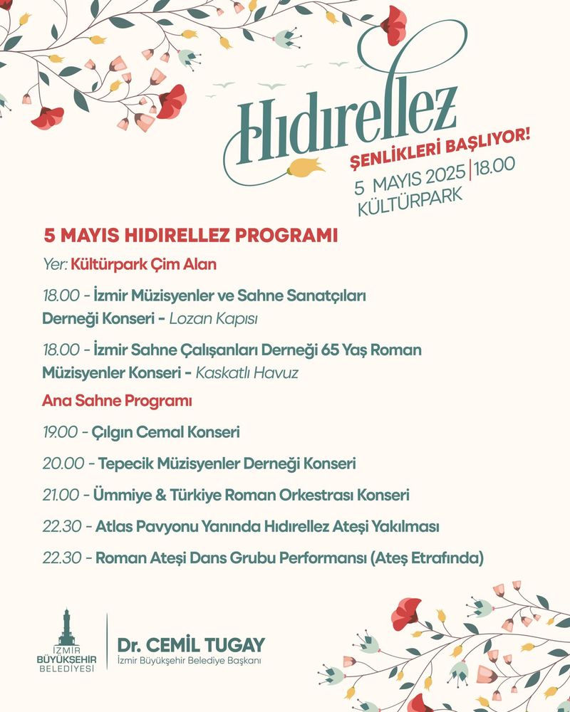 Baharın müjdecisi Hıdırellez, 5 Mayıs’ta Kültürpark’ta birbirinden güzel etkinliklerle kutlanacak. 18.00’de konserler başlıyor, 22.30’da ise Hıdırellez Ateşi yakılacak. Konak Ege Mahallesi ile Bayındır Çırpı’da da konserler var.