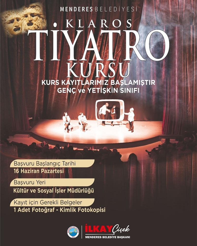 Tiyatro eğitimlerine katılmak isteyen vatandaşlar 1’er adet kimlik fotokopisi ve fotoğraf ile Menderes Belediyesi Kültür ve Sosyal İşler Müdürlüğü'nde kayıt işlemini yaptırabilecek. Menderes Belediyesi Klaros Tiyatro Topluluğu tarafından verilecek olan eğitimlerde katılımcılar doğaçlama, diksiyon ve sahne teknikleri gibi konularda dersler alacak.