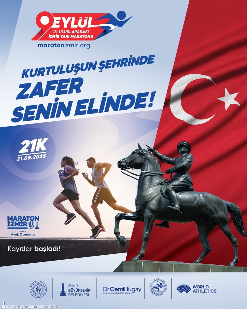 İzmir Büyükşehir Belediyesi’nin düzenlediği 13’üncü Uluslararası Dokuz Eylül İzmir Yarı Maratonu için kayıtlar başladı. 21 Eylül’de kurtuluşun ve kuruluşun şehrinde zafer yaşamak isteyen sporcular https://www.maratonizmir.org/ adresinden kayıtlarını yapabilecek.