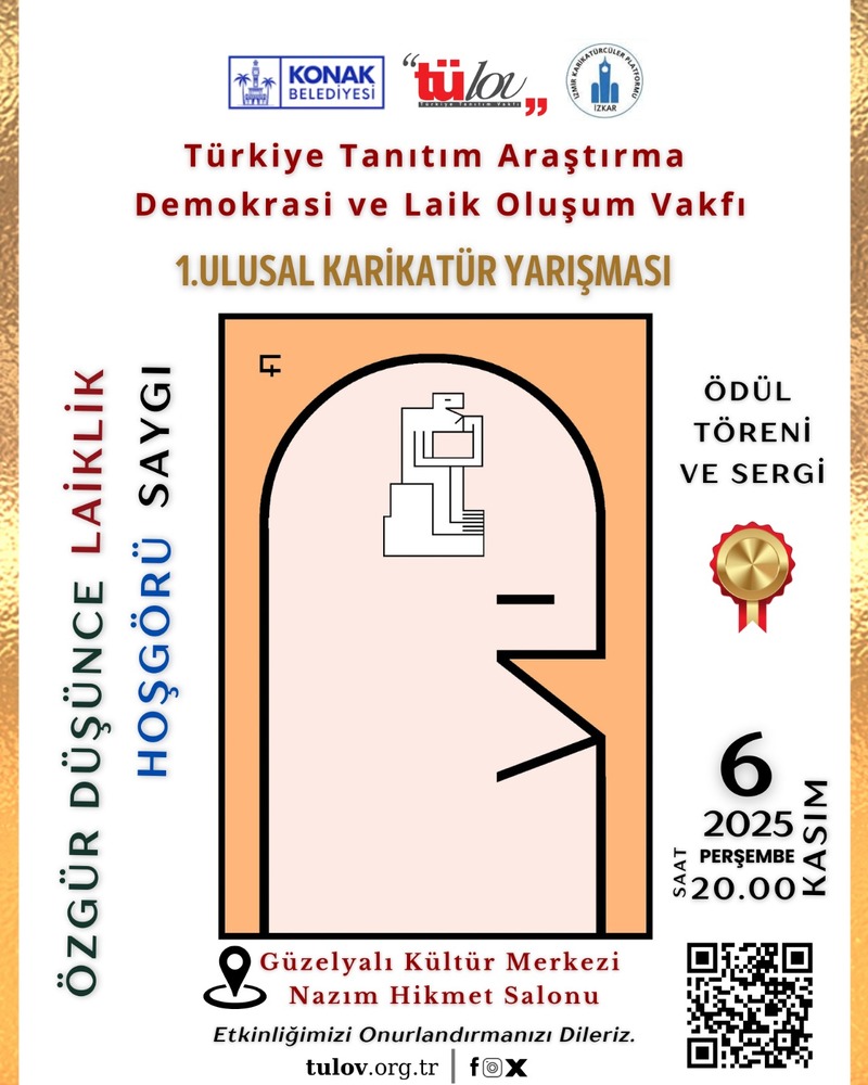 TÜLOV Vakfı 1. Ulusal Karikatür Yarışması’nın ödül töreni ve sergisi, 6 Kasım 2025 Perşembe günü saat 20.00’de, Güzelyalı Kültür Merkezi Nazım Hikmet Salonu’nda gerçekleştirilecektir.