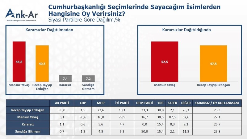 Kararsızlar dağıtıldığında ise Yavaş'ın oy oranının yüzde 52,5 olduğu Erdoğan'ın ise yüzde 47,5'te kaldığı görüldü.