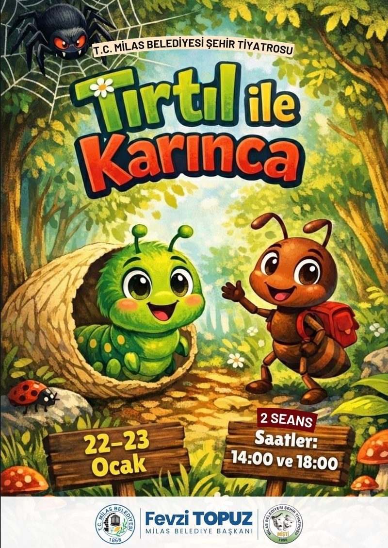 Milas Belediyesi tarafından çocukların kültürel ve sosyal gelişimine katkı sağlamak amacıyla düzenlenen ücretsiz tiyatro etkinliğine bir yenisini ekliyor. Çocukların hayal dünyasını zenginleştirmeyi hedefleyen ‘Tırtıl ile Karınca’ adlı oyun Milas Belediyesi ŞehirTiyatrosu ekibi tarafından sahnelenecek. Çocukların hem eğleneceği hem de öğreneceği oyunda dürüstlük, çevre bilinci ve dostluk gibi temalar interaktif bir dille anlatılıyor.