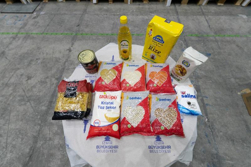 İzmir Büyükşehir Belediyesi’nin hanelere teslim ettiği paket içinde mercimek, pirinç, kuru fasulye, nohut, makarna, bulgur, salça, un, sıvı yağ, tuz, çay ve şeker yer aldı.