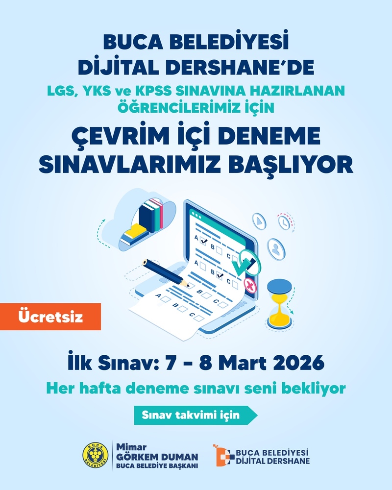 Buca Belediyesi’nin 16 bin öğrenciye ücretsiz eğitim imkânı sunduğu Dijital Dershane platformu, LGS, YKS ve KPSS adayları için "Online Seri Deneme Sınavları" başlatıyor. Buca Belediye Başkanı Mimar Görkem Duman, hayallerindeki okullara girmek isteyen tüm öğrencileri ücretsiz gerçekleştirilecek sınavlara davet etti.