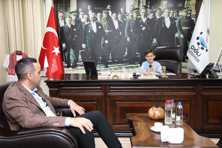 Çiğli Belediye Başkanı Onur Emrah Yıldız, 23 Nisan Ulusal Egemenlik ve Çocuk Bayramı kapsamında bu yıl başkanlık koltuğunu üç öğrenciye birden devretti. TAKEV İlkokulu 3. sınıf öğrencisi 9 yaşındaki Berk Güray ile Mehmet Hikmet Kaşerci Ortaokulu 6. sınıf öğrencileri 11 yaşındaki Ada Ekici ve Kemal Asaf Bağatır, temsili olarak başkanlık görevini üstlendi.