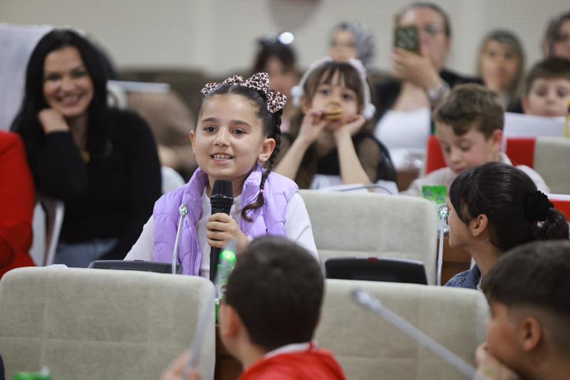 Kınay, başkan yardımcıları, meclis üyeleri ve belediye ekiplerini çocuklara tanıtarak belediyecilik hizmetleri hakkında bilgi verdi. “Bugün belediye sizde, Karabağlar sizde” diyerek çocuklara söz hakkı tanıdı.