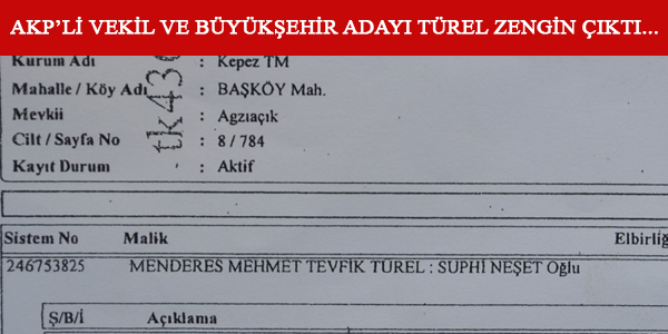 Kepez Başköy’de, 760 bin lira rayiç bedeli ödeyerek aldığı 2B arsası hakkındaki iddialara cevap veren Türel, “Gizli saklı bir konu değildir” dedi. AKP Genel Başkan Yardımcısı ve Antalya Milletvekili Menderes Türel, tapusunu yayınlayarak kamuoyuna duyurduğumuz Kepez Başköy’de 42 dönümlük 2B arazisine sahip olduğunu kabul etti. Türel, dönümü 18 bin liraya gelen 760 bin lira rayiç bedelli bu arsayı belediye başkanı ya da milletvekili olmadığı 2009 yılında aldığını açıkladı. Ancak tapu tarihinde 5 Eylül 2013 yazması ise şüphe uyandırdı.