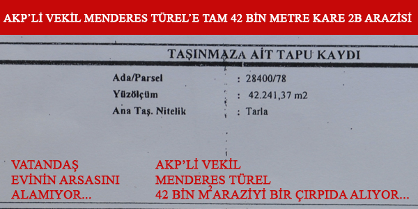 Aksu’da, Mazıdağı’nda, Kaş’ta, Alanya’da, Serik’te, Antalya’nın birçok bölgesinde bu sorun yaşanırken vatandaşların sesini duyurmaya çalıştıkları Türkiye Büyük Millet Meclisi’ndeki bir ismin de 2B arsası olduğu ortaya çıktı. AK Parti Genel Başkan Yardımcısı ve Antalya Milletvekili Menderes Türel’in Kepez Başköy’de 42 bin 241 metrekarelik 2B arazisine sahip olduğu saptandı.