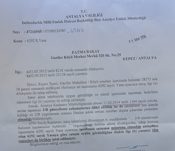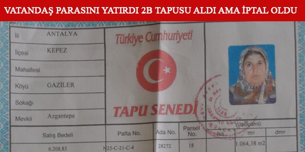Adalet ve Kalkınma Partisi Genel Başkan Yardımcısı ve Antalya Milletvekili Menderes Türel, Kepez Başköy Mahallesi’nde bulunan 42 dönümlük tarlasının tapusunu 5 Eylül 2013 tarihinde aldı. Asil vatandaş ise hazır tapusundan oldu. Fatma Bakay, Gaziler Mahallesi’ndeki 2B arazisinin rayiç bedelini ödeyerek 9 Ekim 2013 tarihinde tapu aldı. Ancak bu tapu 15 gün sonra iptal edildi.
