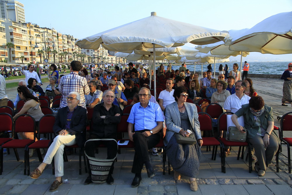 Konak Belediyesi’nin düzenlediği Uluslararası İzmir Şiir Buluşması salon etkinliklerinin ardından sokaklara taştı. Alsancak Vapur İskelesi önünde buluşan şairler, İzmirlilere imbat eşliğinde şiir ziyafeti yaşattı. Haluk Çetin Nazım hikmet Ran, Ahmed arif gibi unutulmaz şairlerin eserlerinin bestelerini İzmirliler için gitarı eşliğinde seslendirdi. Müzikle geçen dakikaların ardından Türkçe, Fransızca, İtalyanca şiirler okundu; farklı dillerin kelimelerin şiirin dilinde birleşti. İzmir’in en büyük şiir etkinliği Uluslararası İzmir Şiir Buluşması’nın ilk günü sevgi ve barış dizeleriyle son buldu.