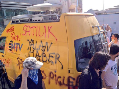 Direnişçiler Taksim Meydanı'nda bulunan NTV yayın aracı üzerine yazılama yaptı: