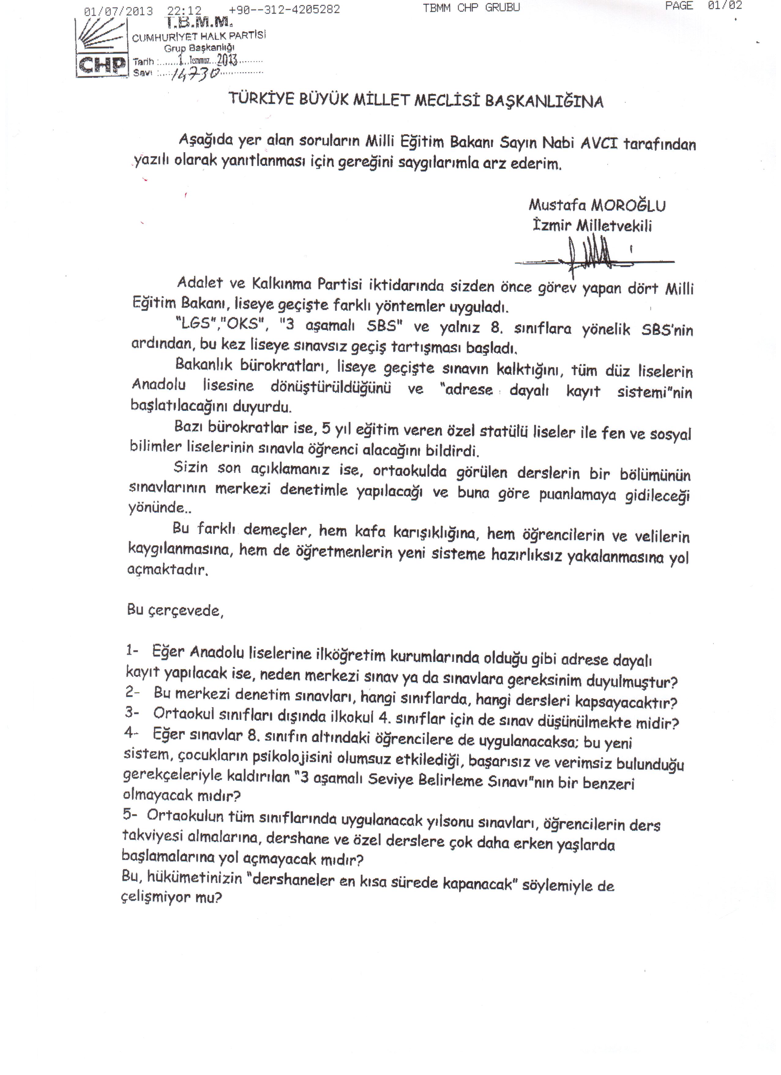 Bakanlık bürokratları ve Bakan Avcı’nın “liseye geçiş”e ilişkin açıklamalarının farklılığının kafa karışıklığına neden olduğunu kaydeden Moroğlu, önergesinde şu görüşleri paylaştı: “Bakanlık bürokratları, liseye geçişte sınavın kalktığını, tüm düz liselerin Anadolu lisesine dönüştürüldüğünü ve adrese dayalı kayıt sisteminin başlatılacağını duyurdu. Bazı bürokratlar ise, 5 yıl eğitim veren özel statülü liseler ile fen ve sosyal bilimler liselerinin sınavla öğrenci alacağını bildirdi. Sizin son açıklamanız ise, ortaokulda görülen derslerin bir bölümünün sınavlarının merkezi denetimle yapılacağı ve buna göre puanlamaya gidileceği yönünde. Farklı demeçler, kafa karışıklığına, öğrencilerin ve velilerin kaygılanmasına, öğretmenlerin yeni sisteme hazırlıksız yakalanmasına yol açmaktadır.”