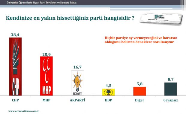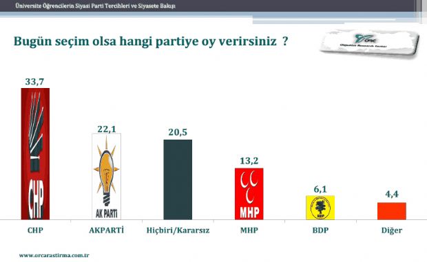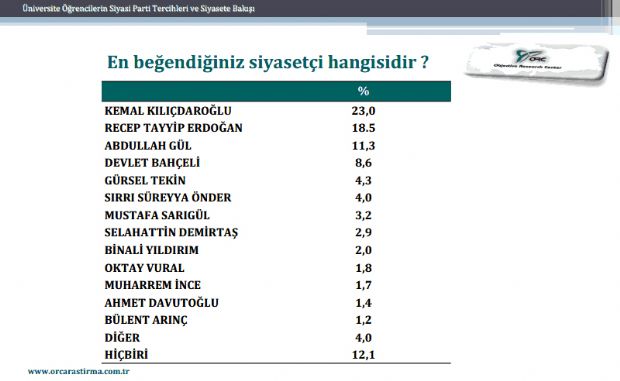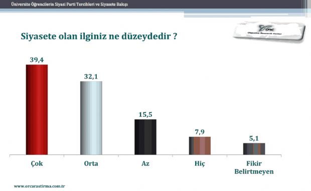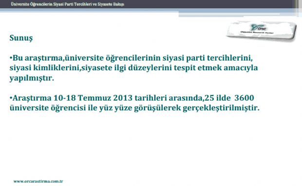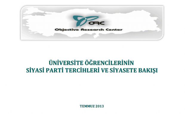Objective Research Center´ın (ORC) ´Üniversite Öğrencilerinin Siyasi Parti Tercihleri ve Siyasete Bakışı´� araştırması tamamlandı. Üniversite öğrencilerinin siyasi parti tercihlerini, siyasi kimliklerini, siyasete ilgi düzeylerini tespit etmek amacıyla yapılan araştırma, 10-18 Temmuz 2013 tarihleri arasında, 25 ilde 30 farklı üniversiteden 3 bin 600 öğrenci ile yüz yüze görüşülerek gerçekleştirildi.