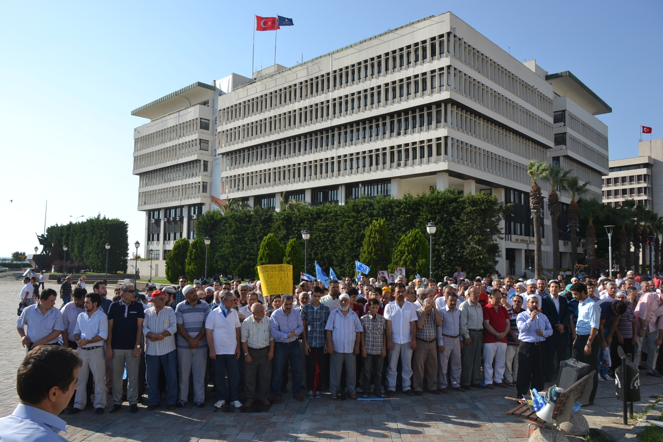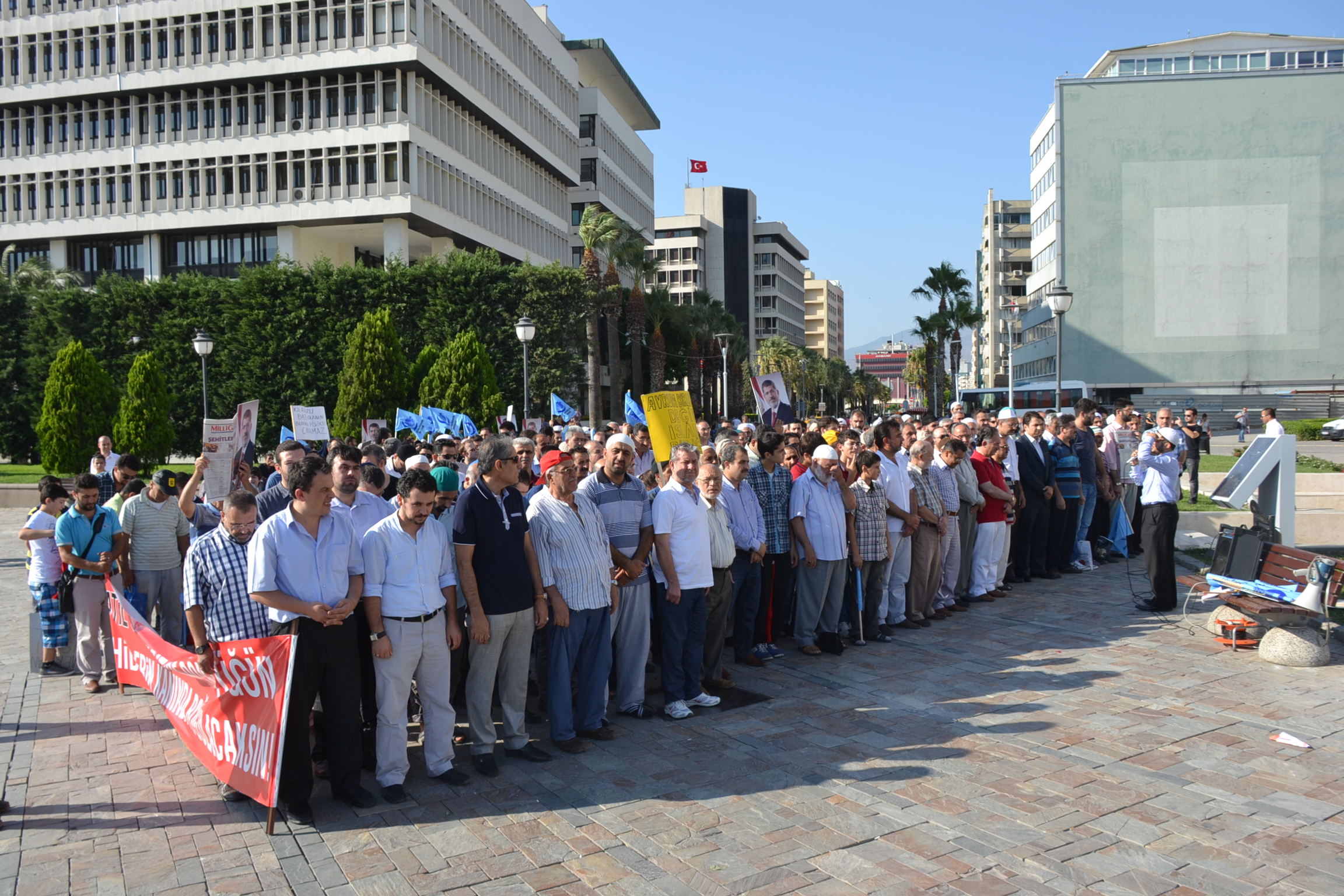 Yaklaşık yüz kadar vatandaş, Mısır’da hayatını kaybedenleri anmak için Konak Meydanı’nda cenaze namazı kıldı. Mısır’da yönetime el koyan ordunun Muhammed Mursi’yi cumhurbaşkanlığından uzaklaştırdığı 3 Temmuz’dan bu yana yüzlerce insanın hayatını kaybetmesini protesto eden Anadolu Gençlik Derneği, cenaze namazının ardından basın açıklaması yaparken grup sık sık tekbir getirdi.