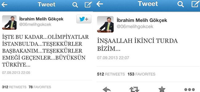 Saat 22.05’te "İŞTE BU KADAR..OLİMPİYATLAR İSTANBUL’DA…TEŞEKKÜRLER BAŞBAKANIM… TEŞEKKÜRLER EMEĞİ GEÇENLER… BÜYÜKSÜN TÜRKİYE…” şeklinde tweet atan Gökçek daha sonra bunu düzeltti.