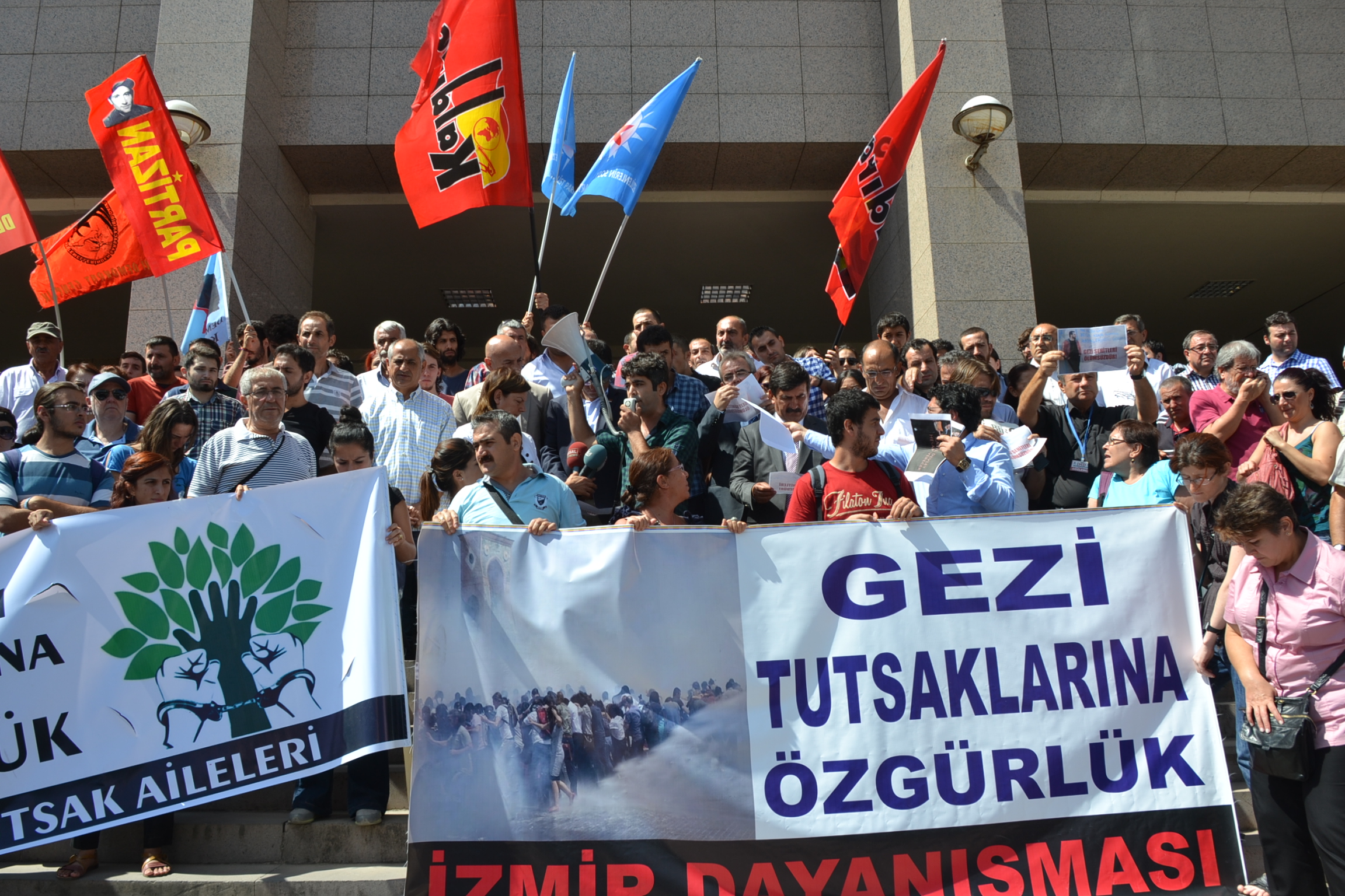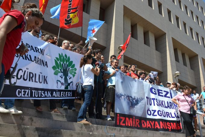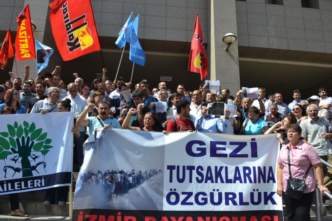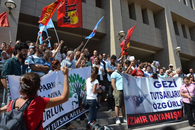 Ege’nin Sesi-Ali Arda PERK/ İstanbul Taksim Gezi Parkı olaylarına destek verip, İzmir'de gösterilere katıldıkları iddiasıyla ilk operasyonda tutuklanan, Vedat Y., İbrahim K., Elif K., Kubilay İ., Ozan A., Erhan İ., Orhan Ö. ve İzzet U hakkında, ‘’2911 sayılı yasaya muhalefet, görevi yaptırmamak için direnme ve terör örgütü üyesi olmamakla birlikte terör örgütü adına suç işlemek’’ suçlamasıyla 17'şer yıl hapis cezası istemiyle, 12. Ağır Ceza Mahkemesi”nde açılan dava sabah saatlerinde görülmeye başladı.